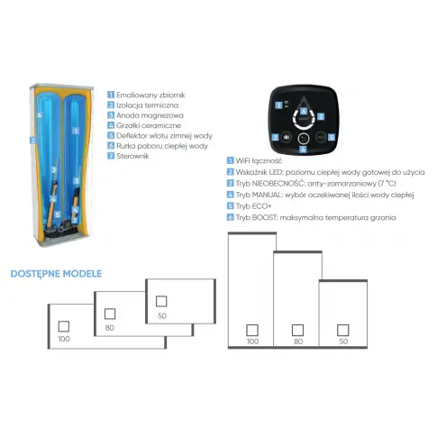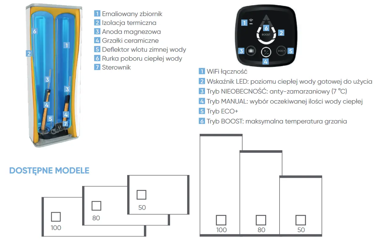 - tryb przyspieszonej pracy BOOST (dodatkowy prysznic w mniej niż 30 min)