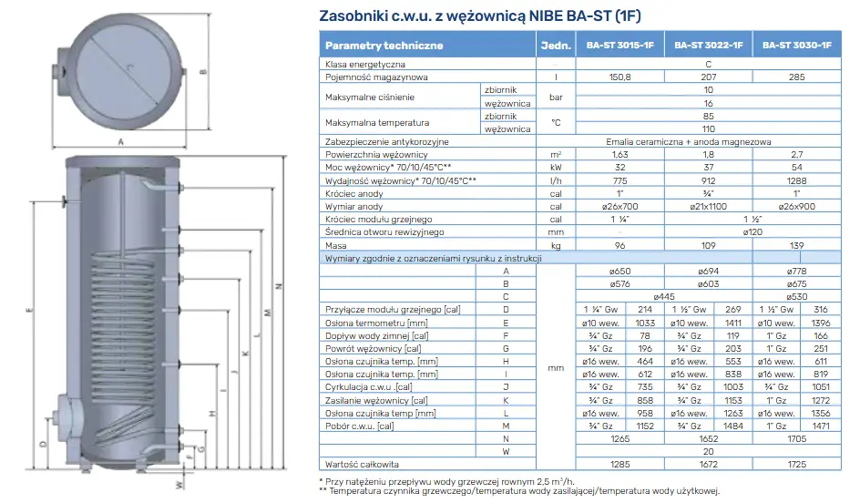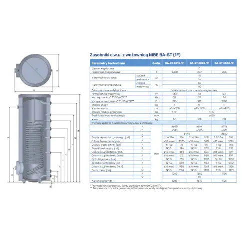 Działanie: Zasobniki NIBE BA-ST 1F, przeznaczone są do podgrzewania i magazynowania wody użytkowej przede wszystkim przy współpracy z pompami ciepła. Odpowiednio zaprojektowane umożliwiają optymalne wykorzystanie czynnika grzewczego o temperaturze 55-60°C. Urządzenia mogą współpracować z pompami ciepła, kotłami gazowymi, olejowymi itp. Duża powierzchnia wężownicy w zasobniku