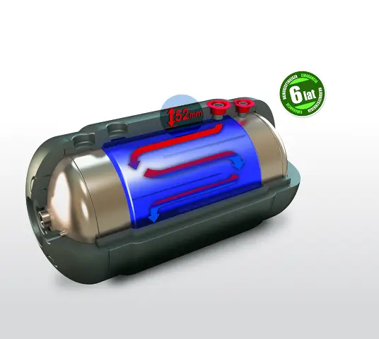 Zasada działania: Zbiornik na wodę użytkową po zewnętrznej stronie opasany jest dodatkowym płaszczem stalowym tworzącym wymiennik o dużej powierzchni grzewczej. Pozwala to na szybkie podgrzanie wody użytkowej przez wodę kotłową przepływającą w przestrzeni między płaszczami. Wymiennik dwupłaszczowy jest jednym z najwydajniejszych wymienników lecz w podstawowej wersji czynnik grzewczy przepływa po najmniejszej linii oporu od wlotu do wylotu dwupłaszcza. Pozostawia to część powierzchni wymiennika niemal w strefie martwej, w której odbywa się tylko śladowa wymiana ciepła, gdyż nie dopływa tam odpowiednia ilość ciepłej wody z kotła. Wprowadzone przegrody w wymienniku najpierw rozdzielają wpadającą strugę wody na dwie równe połówki, a następnie kierują ją zakolami w dół do wyjścia z wymiennika. Wymusza to przepływ wody przez całą powierzchnię płaszcza wodnego, a co za tym idzie zwiększa jego wydajność. Urządzenia te, mają zbiorniki ciśnieniowe na wodę użytkową wykonane z blachy stalowej pokrytej wewnątrz warstwą specjalnej, wysokotemperaturowej emalii ceramicznej, która tworząc szklistą powłokę chroni je przed korozją. Dodatkowym zabezpieczeniem antykorozyjnym zbiorników jest anoda magnezowa, której działanie opiera się na różnicy potencjałów elektrochemicznych materiału zbiornika i anody.