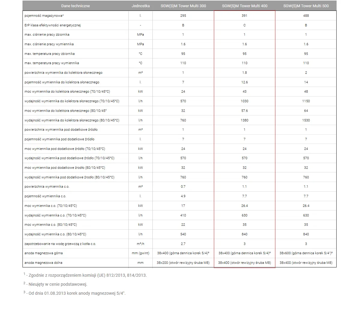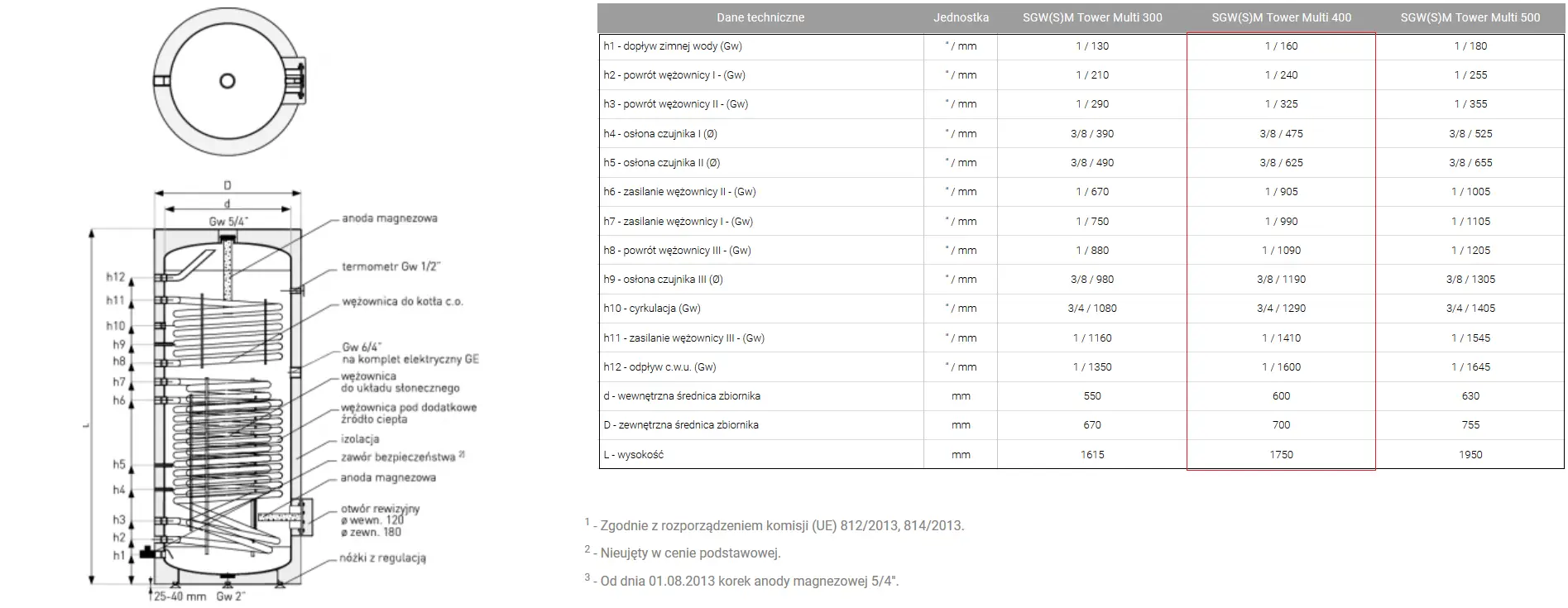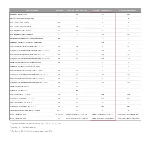 Zastosowanie: Tower Multi, to pionowy wymiennik c.w.u. z trzema wężownicami spiralnymi zasilany, w głównej mierze, czystą energią słoneczną. Możliwość zasilania z 4 źródeł, jednocześnie, gwarantuje najkorzystniejsze wykorzystanie dostarczonego ciepła i największy komfort użytkowania. Dostępne pojemności: 300, 400 lub 500 litrów zapewniają wydajną pracę systemu c.w.u., w domach jednorodzinnych.