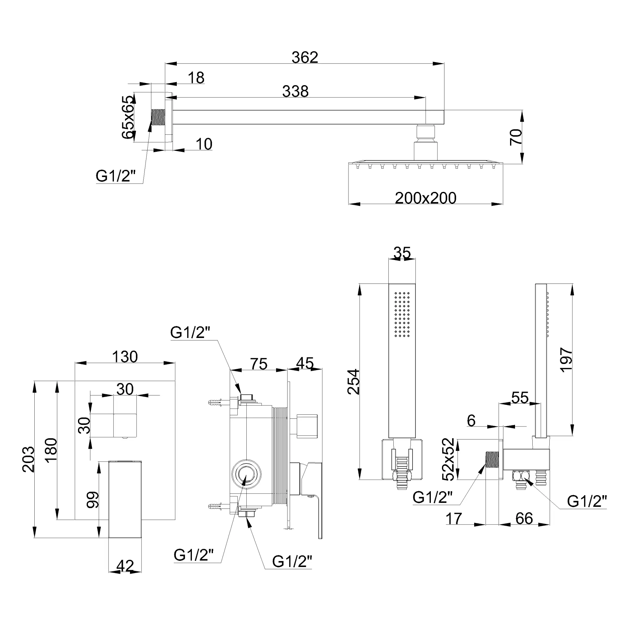 Bateria, Deszczownica, Ramię natrysku, Słuchawka prysznicowa, Uchwyt słuchawki prysznicowej, Wąż natryskowy |