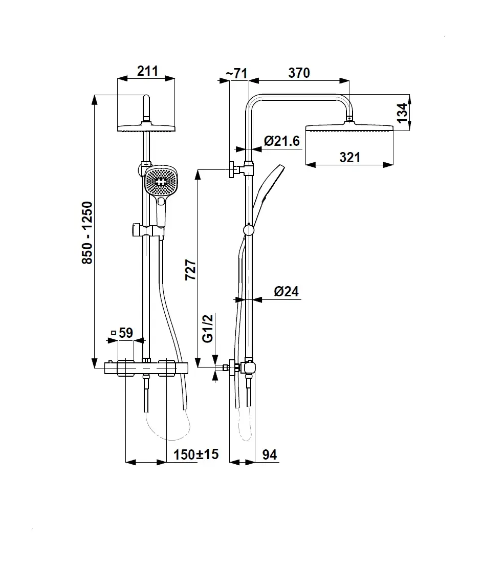 Wyposażenie: Bateria, Deszczownica, Drążek, Słuchawka prysznicowa, Uchwyt słuchawki prysznicowej, Wąż natryskowy