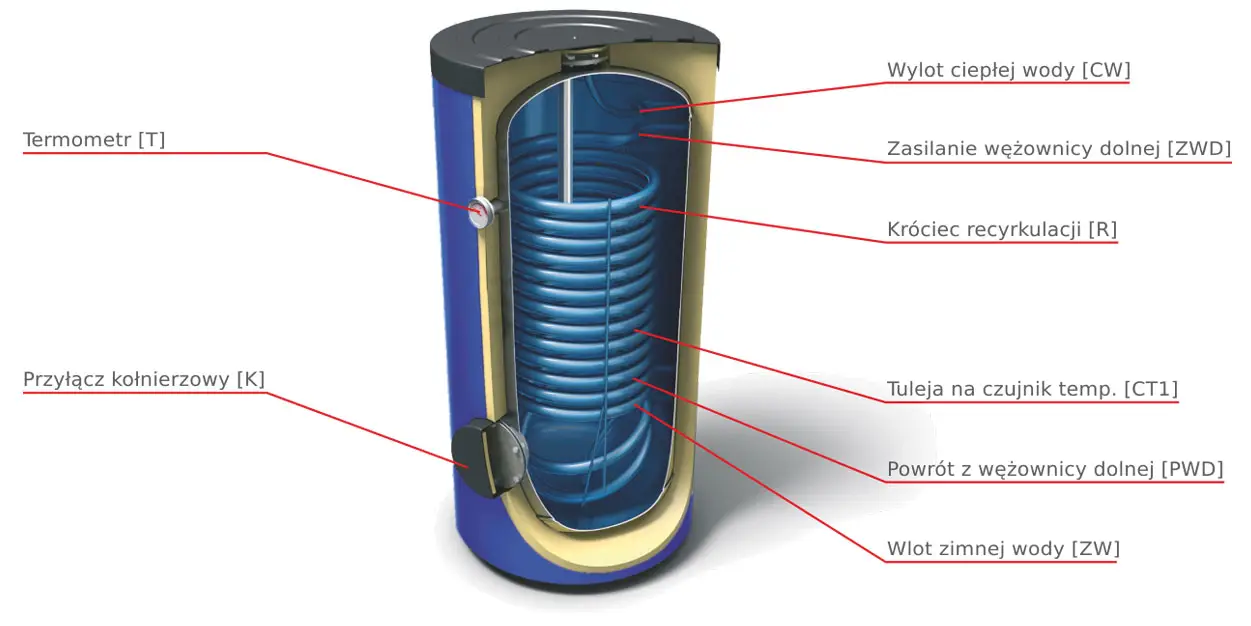 DUŻA MOC GRZEWCZA dzięki zastosowaniu wężownicy spiralnej o dużej powierzchni grzewczej, co gwarantuje szybkie ogrzewanie wody użytkowej.