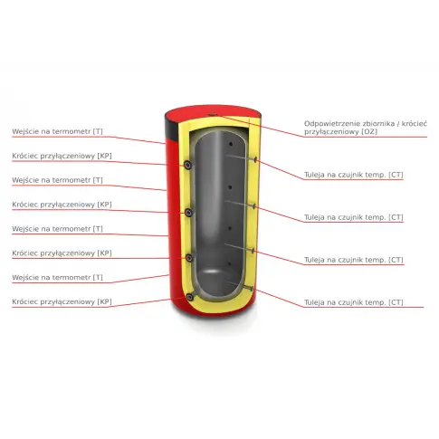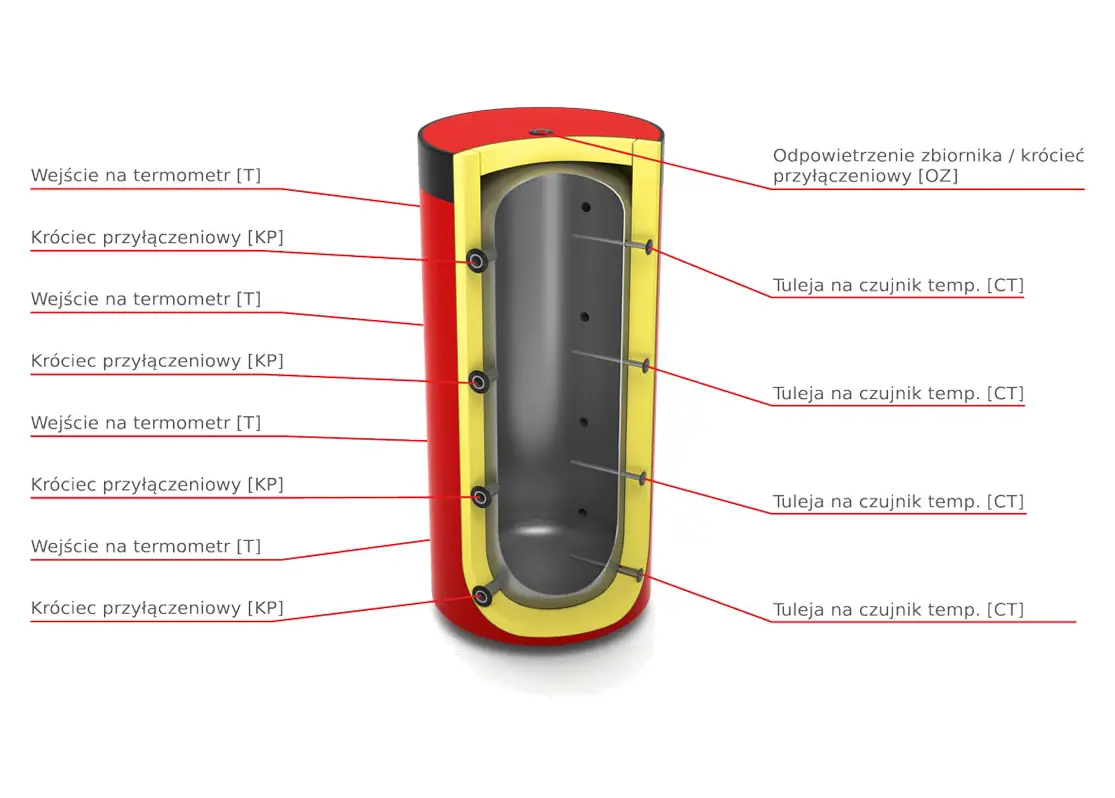 Zbiorniki typu BUFOR przeznaczone sa do gromadzenia, przechowywania, ogrzewania i przekazywania nadmiaru ciepłej wody kotłowej/ grzewczej lub innych płynów dopuszczonych do kontaktu ze stalą węglową uzyskanych z różnych źródeł ciepła: kotłów c.o., kolektorów słonecznych, pomp ciepła itp. Zbiorniki buforowe stanowią zabezpieczenie instalacji c.o. - przejmują różnicę pomiędzy mocą cieplną kotła i mocą oddawaną do układu grzewczego. Maksymalne ciśnienie pracy zbiornika wynosi 0,3 MPa (ok. 3 bar).
