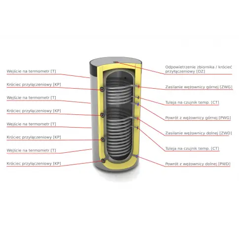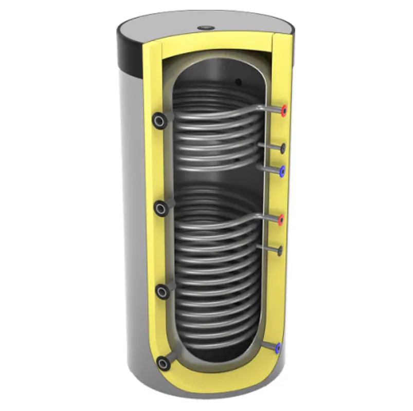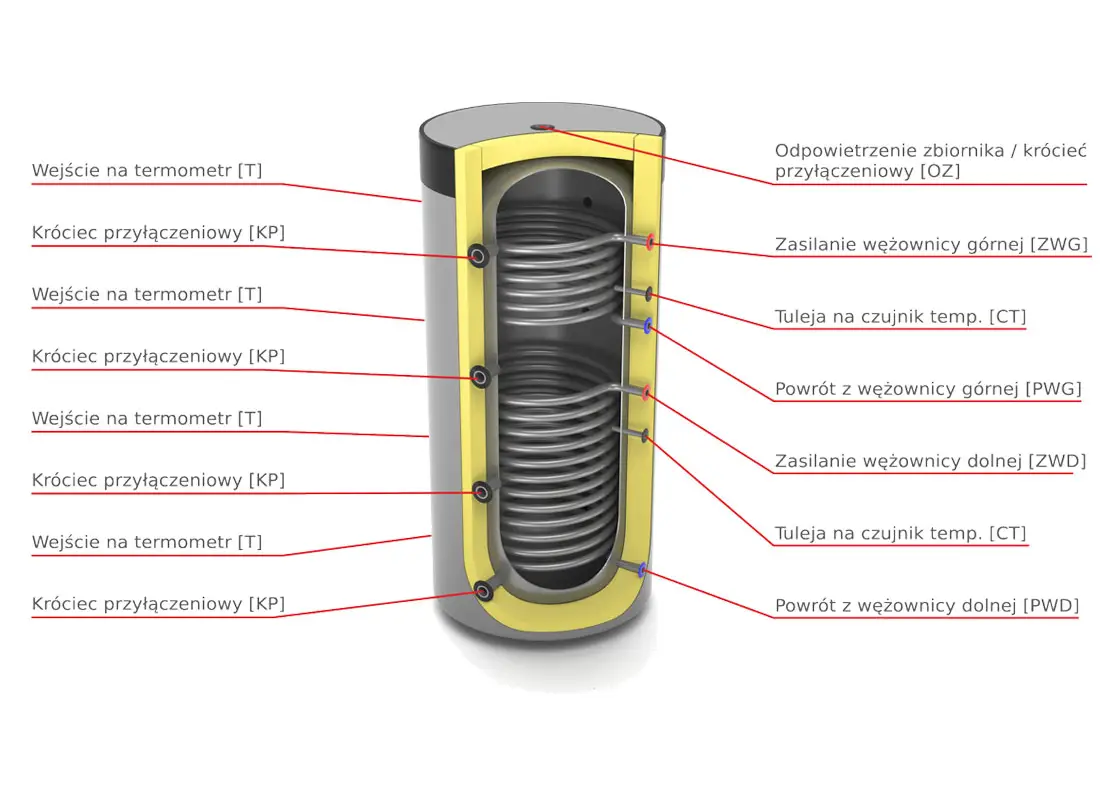 dzięki zastosowaniu dwóch wężownic spiralnych o dużej powierzchni grzewczej, co gwarantuje szybkie ogrzewanie wody kotłowej.